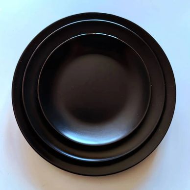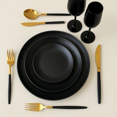 Una combinaciòn perfecta de sofisticaciòn y modernidad: vajilla en negro mate acompañada de cubiertos dorados y copas negras que evocan lujo absoluto, Ideal para cenas VIP, bodas exclusivas y eventos que buscan un estilo imponente y distinguido