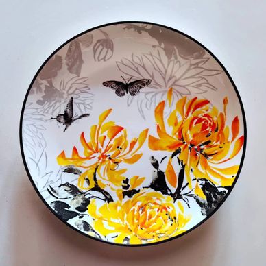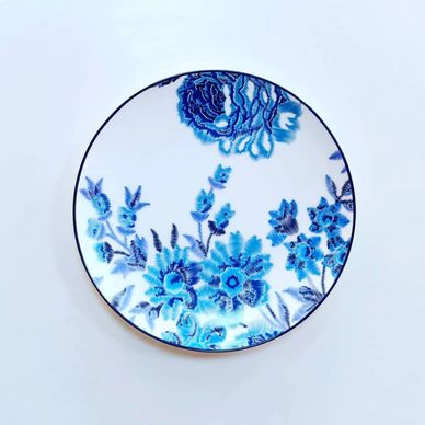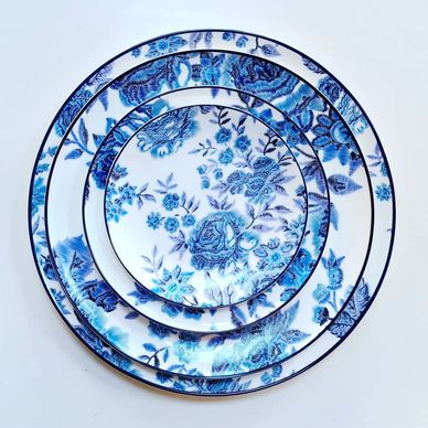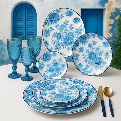Inspirada en la elegancia del Mediterraneo, con delicados motivos florales en azul sobre blanco que evocan frescura y distinciòn. Perfectas para mesas VIP con un toque clàsico y sofisticado