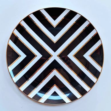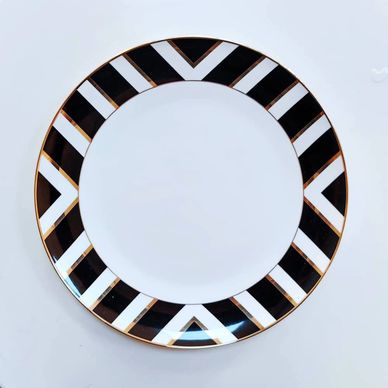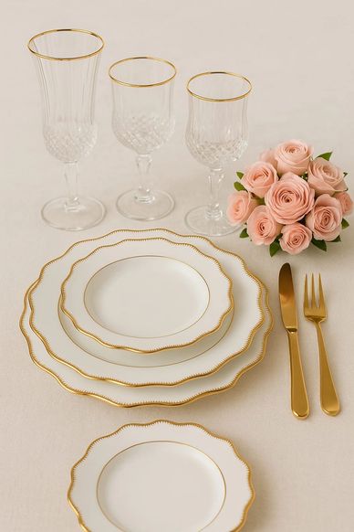 Con delicados bordes ondulados en dorado, esta vajilla aporta distinciòn y sofisticaciòn a cualquier mesa. Ideal para eventos exclusivos que buscan un detalle de lujo en cada presentacion.
