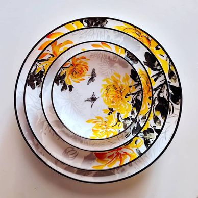 Esta vajilla esta compuesta de 4 piezas, Bajaplato, plato buffet, plato para ensalada y plato para postre