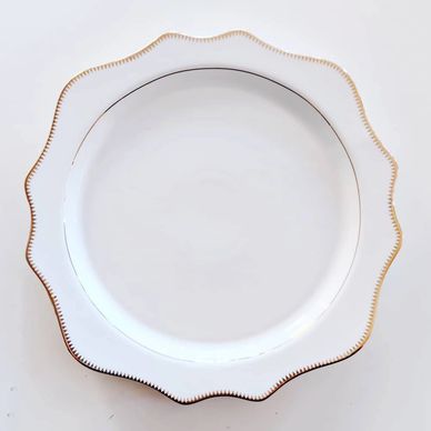 Un clàsico atemporal en blanco con finos bordes dorados y silver, que aporta distinciòn y elegancia a cualquier mesa, ideal para bodas y eventos de lujo