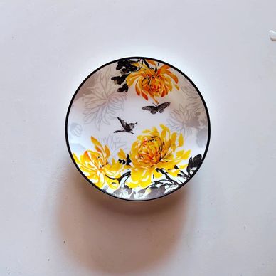 Un diseño exclusivo con flores amarillas vibrantes y detalles en negro, acompañado de copas vintage cristal ambar. Perfecta para realzar la mesa de eventos de alto nivel con un toque de sofisticaciòn y frescura